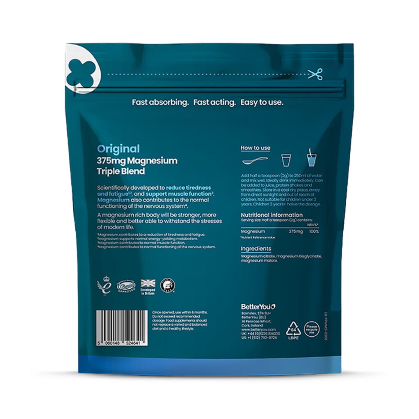 Our triple blend Magnesium Powder is a fast-acting magnesium supplement providing 375mg of elemental magnesium per serving from a carefully balanced blend of magnesium glycinate, citrate, and malate. Scientifically developed, it helps reduce tiredness and fatigue, supports normal muscle function, and contributes to the normal functioning of the nervous system..