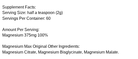 Magnesium Max Original Other Ingredients: Magnesium Citrate, Magnesium Bisglycinate, Magnesium Malate.