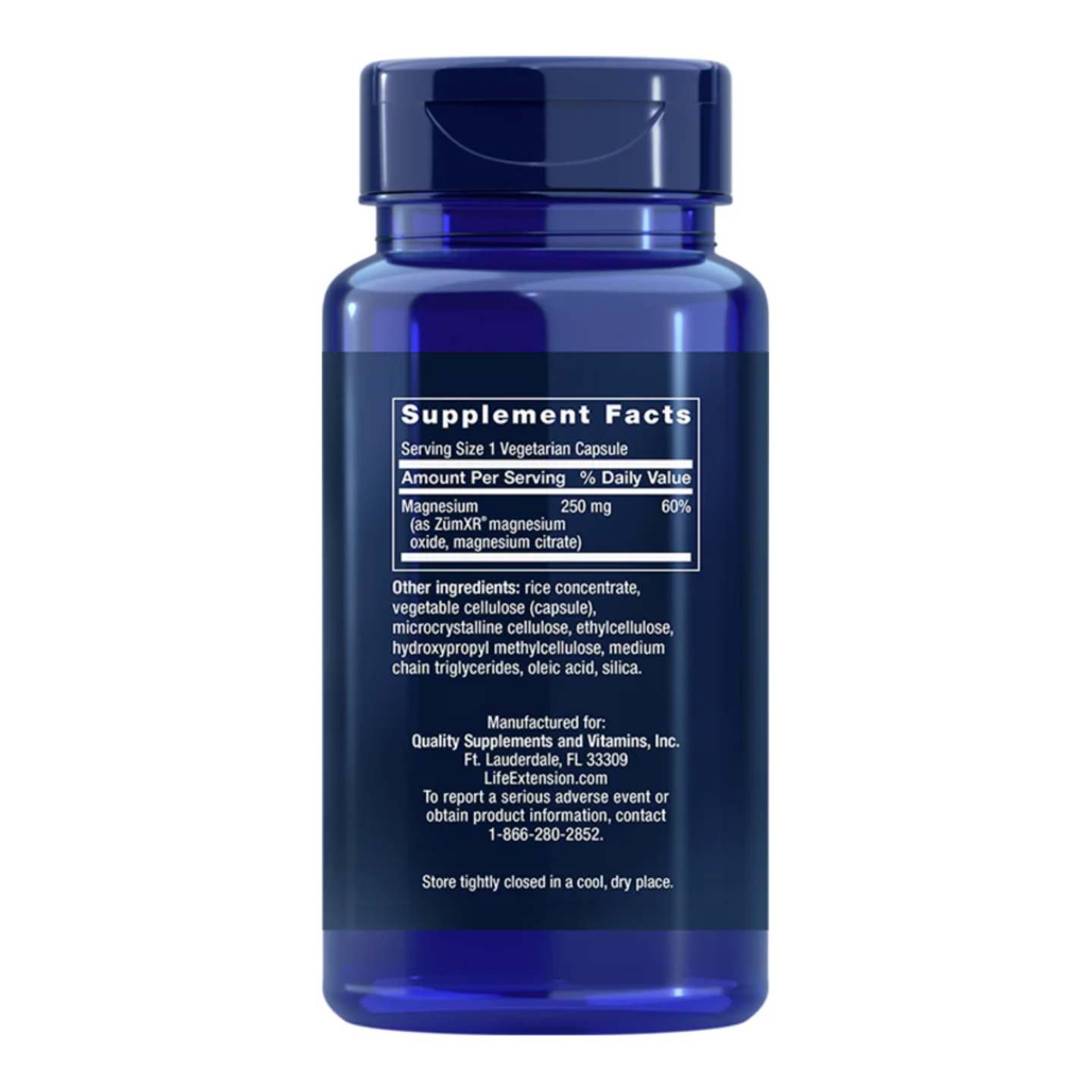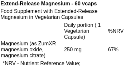 INGREDIENTS: Magnesium (as ZumXR magnesium oxide, magnesium citrate), Rice concentrate, vegetable cellulose (capsule), microcrystalline cellulose, ethylcellulose, hydroxypropyl methylcellulose, medium chain triglycerides, oleic acid, silica.