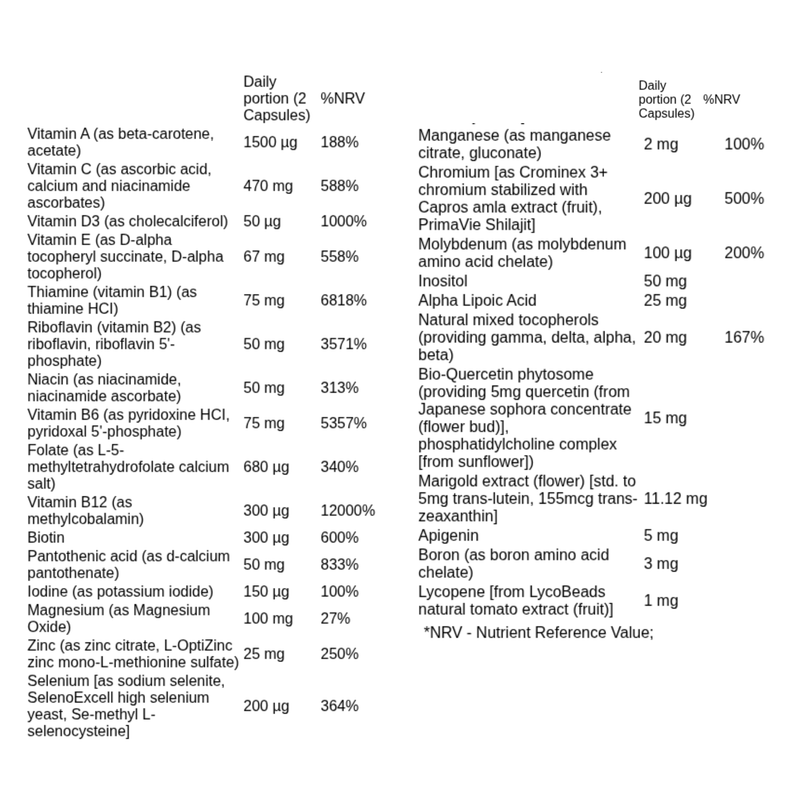 citrate, L-OptiZinc zinc mono-L-methionine sulfate), Selenium [as sodium selenite, SelenoExcell high selenium yeast, Se-methyl L-selenocysteine], Manganese (as manganese citrate, gluconate), Chromium [as Crominex 3+ chromium stabilized with Capros amla extract (fruit), PrimaVie Shilajit],
